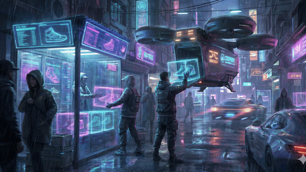 Neon deal on a rain-slick street: a digital sneaker atelier gets packed up and shipped to its next owner. Nano Banana Pro 3.